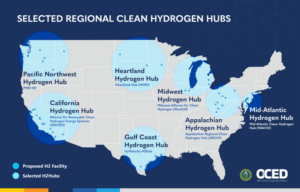 In October, the White House announced the selection of seven Hydrogen Hubs around the U.S. to be a part of the Department of Energy (DOE)’s Regional Clean Hydrogen Hubs Program (H2Hubs), which will deploy $7 billion toward projects over eight to twelve years (or sooner). Launched under the Bipartisan Infrastructure Law, the Hydrogen Hubs program aims to create networks of hydrogen producers, consumers and infrastructure – and is likely to set many precedents that may scale-up in a clean hydrogen economy, ranging from technological strategies to the standard approaches for community engagement. Hub developers now enter their next, more in-depth planning phases to secure the coveted DOE funding and to eventually start building out the Hubs.