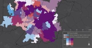 The tangible implications of significant MHDV pollution reductions might be seen in the form of reduced mortality rates and hospitalizations associated with respiratory illnesses. Building upon the first study, which showed a relationship between NOx and respiratory health issues, the maps below (found on page 37 in the new analysis) further suggest that tailpipe emissions, especially in the Raleigh, Durham, and Smithfield focus areas, correlate to higher rates of asthma-related emergency department visits.