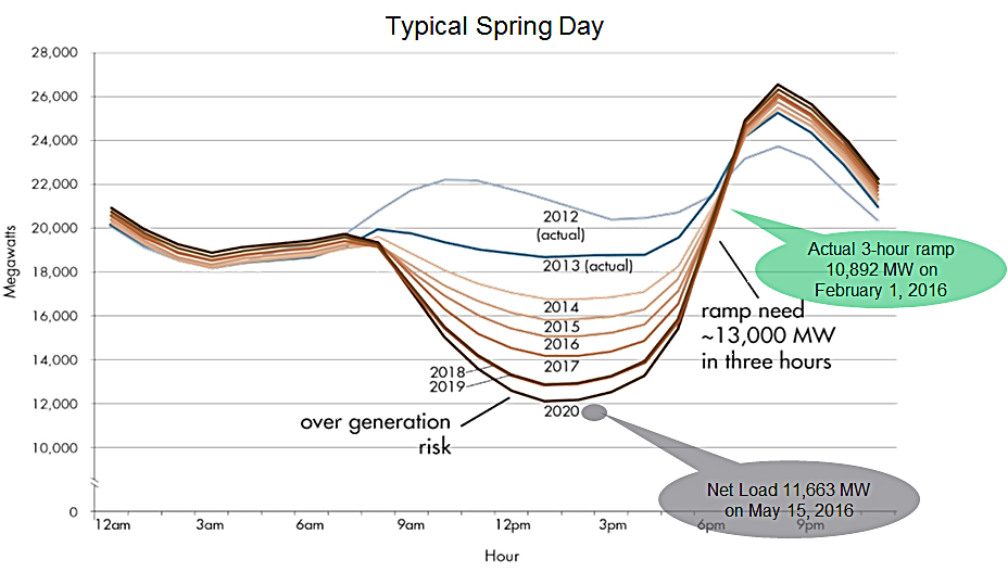 Net Load on CAISO System (projected through 2020). Source: CAISO, “What the duck curve tells us about managing a green grid”, 2016