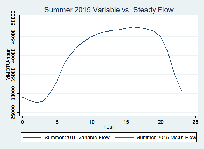 The graph below shows a visual representation of this conflict: the red line is the uniform, flat requirement that gas be delivered in even amounts, whereas the blue line shows how generators actually behave over the course of the day.