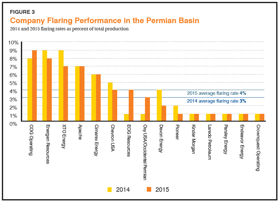 The EDF study analyzed venting and flaring practices in the Permian Basin during the high production years of 2014-2015. We then assessed how top producers performed compared to the region’s average flaring rate in those two years.