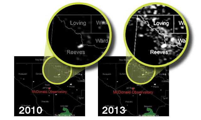 Satellite images show light visible at night increased dramatically from 2010 to 2013, with much of it attributable to oil and gas flaring in the region. Apache Corporation’s “Alpine High” discovery in Reeves County will push oil and gas development to within 40 miles of the observatory.