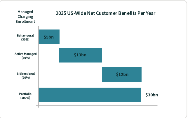 According to a study by EV energy, managed charging could account for $18 billion of a $30 billion annual savings opportunity by 2035, as reflected by the behavioral and active managed charging bars in the graph below. By shifting EV charging away from peak times, utilities can retire expensive peaker plants, defer transmission and distribution upgrades and keep costs down for everyone.