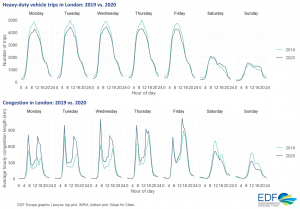 For heavy duty vehicles, we observed lower numbers of trips throughout the day in 2020 compared to 2019. But for congestion this pattern is reversed, with 2020 levels of congestion spiking far above those observed in 2019.