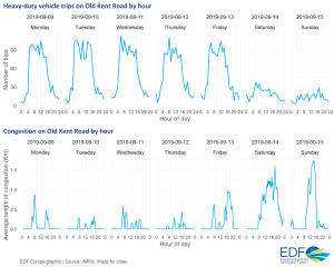 Looking at Old Kent Road trip data from the sample week in September 2019, daily heavy-duty freight vehicle activity showed that trips start early in the day, peaking at 05:00 and staying high until 15:00 on weekdays. The congestion data (for all vehicle types) during the same period on Old Kent Road, reveals that there is no clear relationship between freight movements and congestion. However, it does highlight the times when heavy-duty freight vehicles likely to be stuck in traffic; and, as these vehicles produce more pollution than most passenger cars, the pollution they produce due to congestion is greater.
