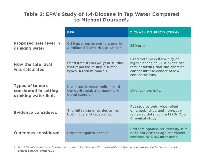 In a 2014 paper, published in the industry’s go-to journal, Dourson argued for an acceptable level of 1,4-dioxane in water that was 1,000 times higher than EPA’s drinking water guideline reflecting elevated risk of cancer. The accompanying chart from the EWG report helpfully illustrates the selective information and analysis Dourson used to derive his weaker standard. EWG’s report notes that a review of Dourson’s work by the State of Michigan rejected his work as flawed and embraced EPA’s more comprehensive methodology.