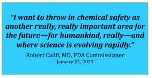But Commissioner Califf has stated that chemical safety is a priority, telling a reporter that “I want to throw in chemical safety as another really, really important area for the future – for humankind, really – and where science is evolving rapidly.”1